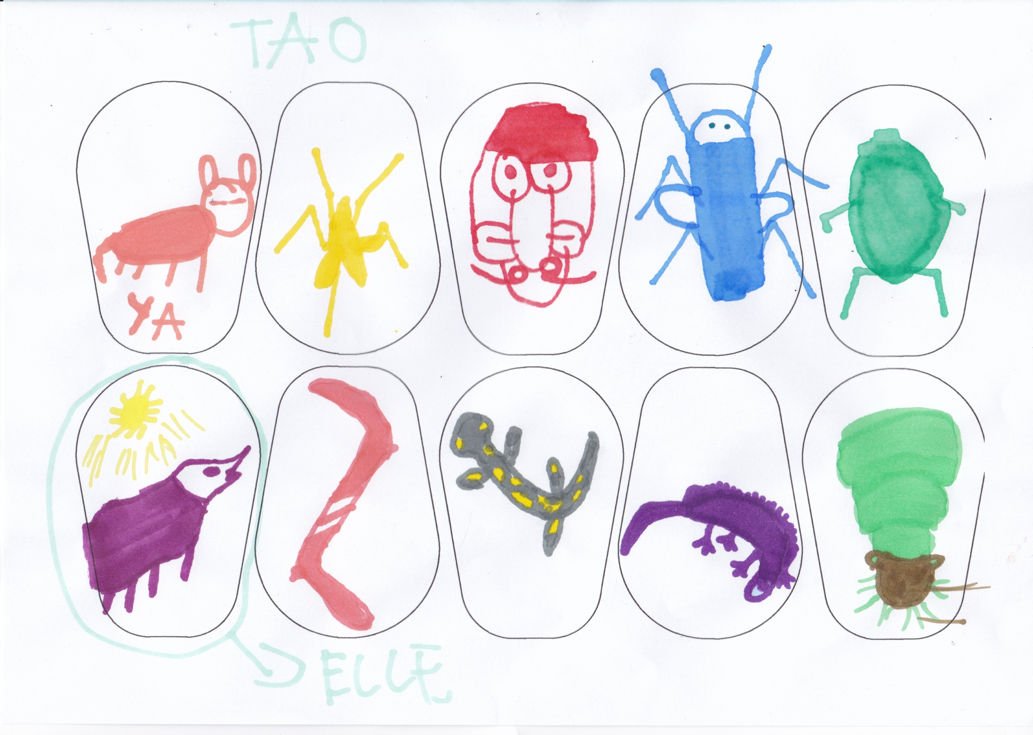 L'installation propose de prêter attention à une vie du sol que les anciennes carrières d'argile accueillent aujourd'hui. Nous avons proposé aux jeunes dessinateurs d'interpréter différentes bêtes salamandre, mulot, cloportes, larves et accueillis dans les remblais qui bordent ce qui est aujourd'hui l'étang de Salzuit.