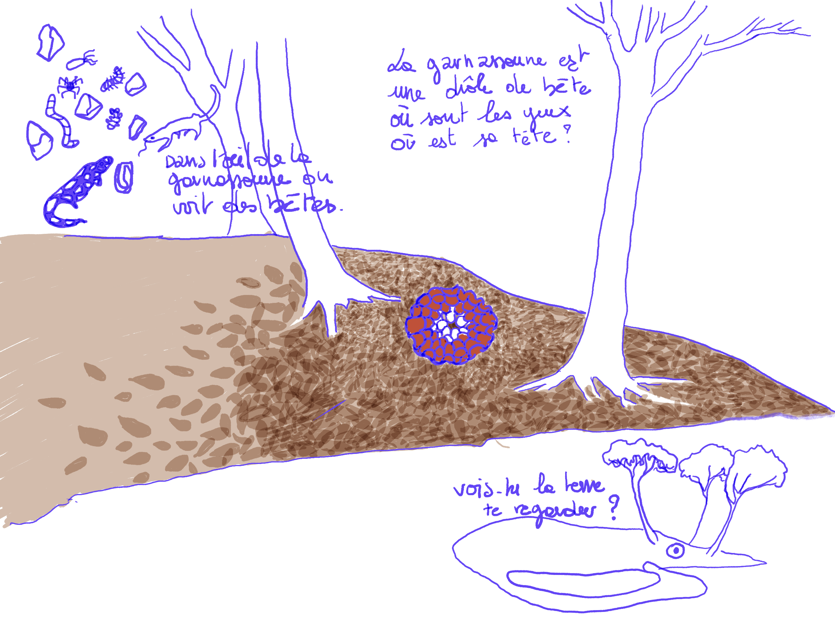 Les carrières d’argiles autour de Paulhaguet étaient autrefois utilisées pour fabriquer des tuiles. Depuis elles sont devenus des étangs, souvent des zones humides qui accueilleunt depuis toute sortes de bêtes. Avec ses reliefs formés des remblais des anciennes tuileries, la Garnassoune fait figure de monstre endormis. Mais si elle est une drôle de bête où sont les yeux, où est la tête ? Depuis ses yeux que voit-on et qui /quoi nous regarde ?