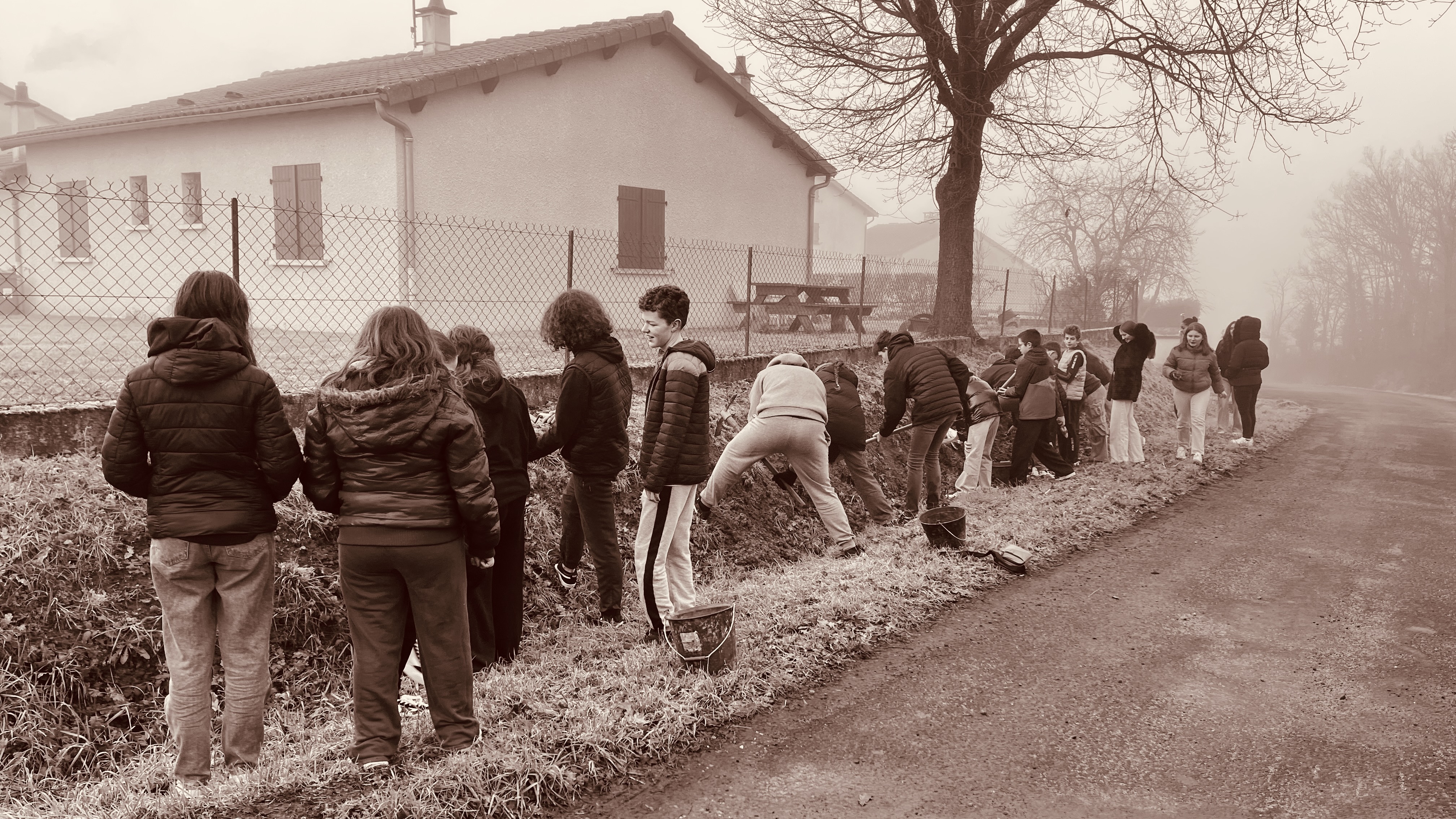 Au Collège de Paulhaguet, nous avons travaillé avec la classe de 4e et leur animatrice. Ce matin, on démarre dehors. A Paulhaguet, l'argile est présent un peu de partout. Situé à la confluence de l'Allier et de la Sénouire, la vie de ce village a pendant longtemps été rythmé par les moulins à argile des tuileries et des biquetteries. Avec les pèles et les sceaux, on creuse dans le talus d'un lotissement pour récupérer un peu de matière. On a amené une quantité de matière séchée au préalable qu'on va ensemble également concasser et tamiser.