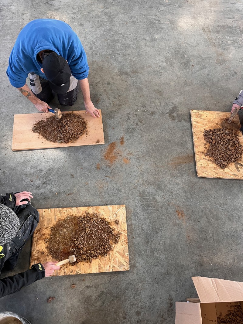 Avec les salarié.es de l'ACI, nous nous rendons à l'étang de la Ganassoune à Salzuit. Iels sont habituellement chargé de son entretient, on peut dire qu'iels connaissent bien les lieux. Dans la veine que nous avons identifié avec Cécile, nous prélevons quelques seaux de terre. Pendant ce temps, nous échangeons avec un des encadrants sur carreaux france ou il a travaillé plusieurs dizaines d'années et son père à la tuilerie avant lui. Les pieds dans cette terre aux qualités plastiques, nous arrivons à la conclusion qu'elle est le matériau qui abrite de la pluie, le gîte d'espèces de zones humides qui profitent des mares qui se forment à cause de son imperméabilité. C'est aussi pour de nombreuses habitant.es humaines du coin ce qui fait la raison d'être ici. Les anciens qui sont venus celleux qui sont resté.es travailler dans les tuileries du bassin paulhaguetois forment les populations d'aujourd'hui. Cette glaise c'est elle qui fait le lit majeur de la Senouire et de l'Allier, il y a donc un lien entre cette qualité de terre et l'eau qui héberge les poissons.